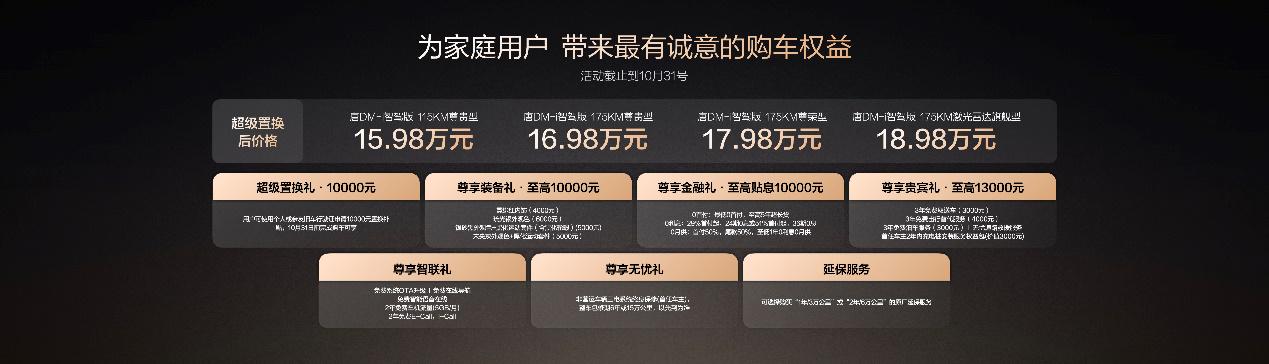 新车同时公布多项购车政策,10月31日前完成购车可享10000元置换补贴。同时,还为用户准备了包含置换补贴在内的至高价值4.3万元礼遇。