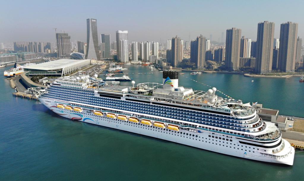 “爱达·魔都号”邮轮靠泊在青岛邮轮母港码头(无人机照片)御龙优配。新华社记者 李紫恒 摄